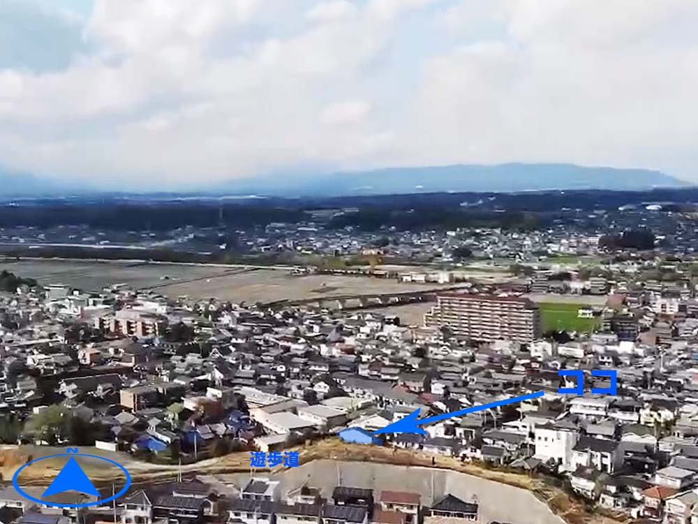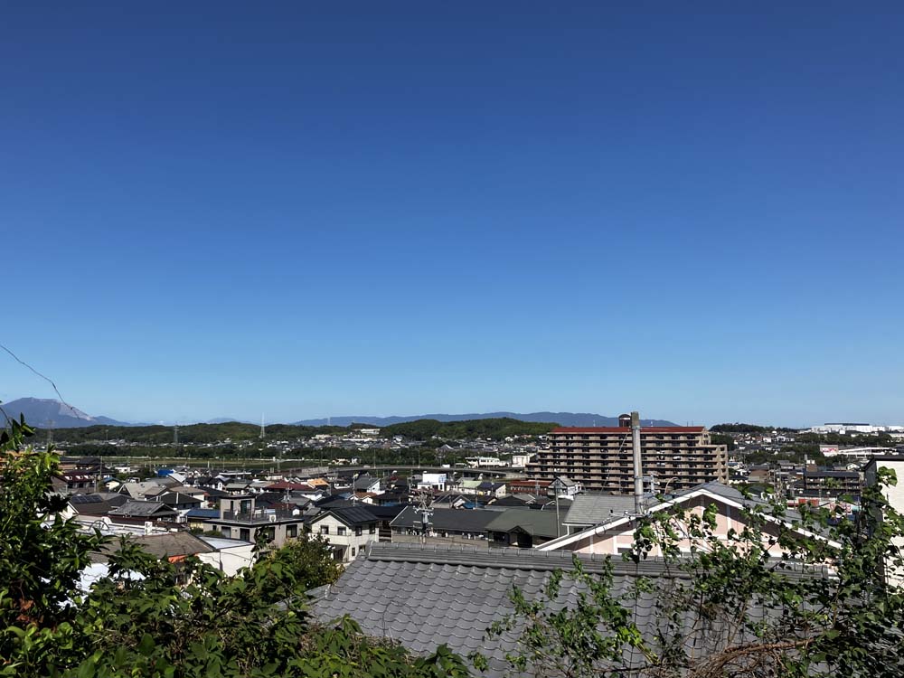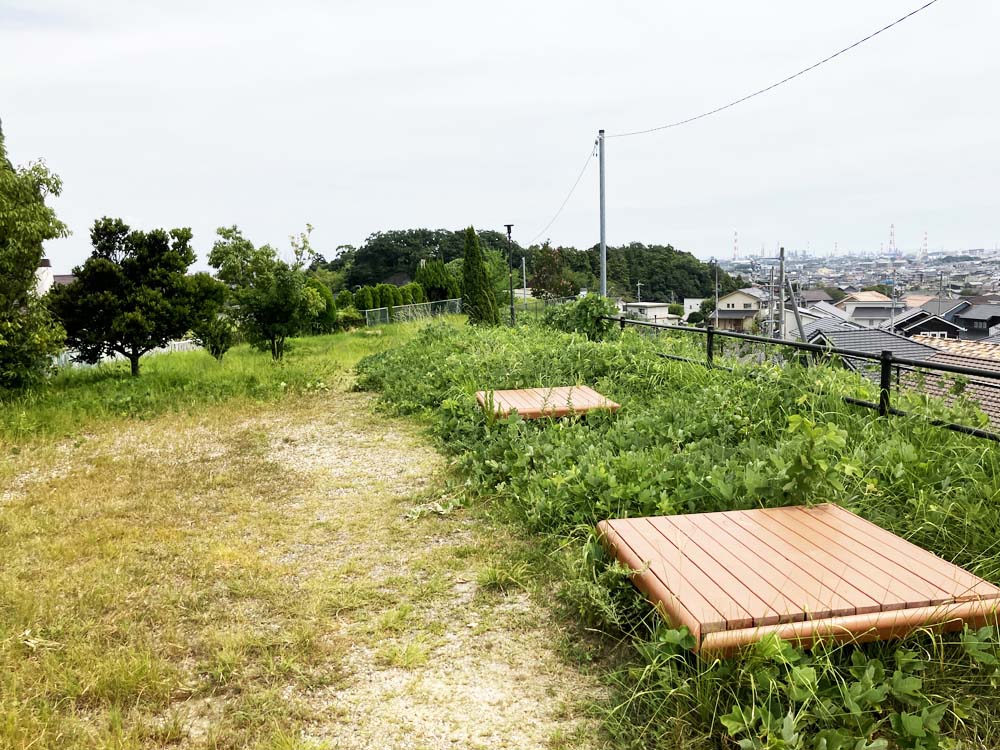 遊歩道に接続している場所は小高くなっていて360度見渡せるから、鈴鹿山脈や四日市市の街並みを眺めることができるよ